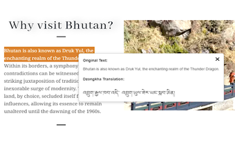 Dzongkha Translator adalah alat yang dirancang untuk memudahkan pengguna dalam menerjemahkan teks dari bahasa Inggris ke Dzongkha secara cepat dan efisien. Tersedia sebagai ekstensi gratis untuk browser Chrome, alat ini memungkinkan pengguna untuk menerjemahkan teks yang dipilih dalam waktu singkat dengan hanya beberapa klik. Fitur ini sangat berguna bagi mereka yang ingin memahami atau berkomunikasi dalam bahasa Dzongkha, baik untuk tujuan pendidikan maupun pribadi.